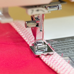 Ce pied permet, soit de fabriquer un ruban passepoil, soit de poser du passepoil sur un ouvrage. Les deux sillons situés sous le pied guident le passepoil et le maintiennent fermement pendant la couture. Largeur maximale de la mèche: 5mm.